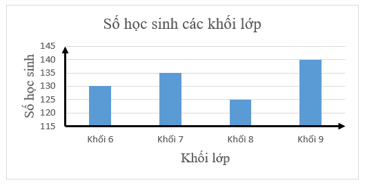 Theo biểu đồ, số học sinh khối 9 nhiều nhất với 140 học sinh. Số học sinh khối 8 ít nhất với 125 học sinh.