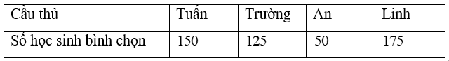 Số học sinh bình chọn cho Tuấn là \(\frac{{500 \cdot 30\% }}{{100\% }} = 150\) (học sinh)
