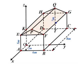 Nhà bác An được mô tả như hình vẽ dưới, trong đó phần thân nhà là hình hộp chữ nhật \(ABCD.EFGH\). Ngôi nhà được lợp ngói hai mái là hai hình chữ nhật \(PEHQ\) và \(PFGQ\), biết tam giác \(EFP\) là tam giác cân tại \(P\). Gọi \(T\) là trung điểm của cạnh \(DC\). Các kích thước của nhà lần lượt là \(AB = 6\,{\rm{m}}\), \(AE = 5\,{\rm{m}}\), \(AD = 8\,{\rm{m}}\), \(QT = 7{\rm{m}}\). Xét hệ trục tọa độ \(Oxyz\) sao cho gốc tọa độ là điểm \(O\) thuộc đoạn \(AD\) sao cho \(OA = 2{\rm{m}}\) và các trục tọa độ tương ứng là các trục \(Ox,Oy,Oz\) như hình.