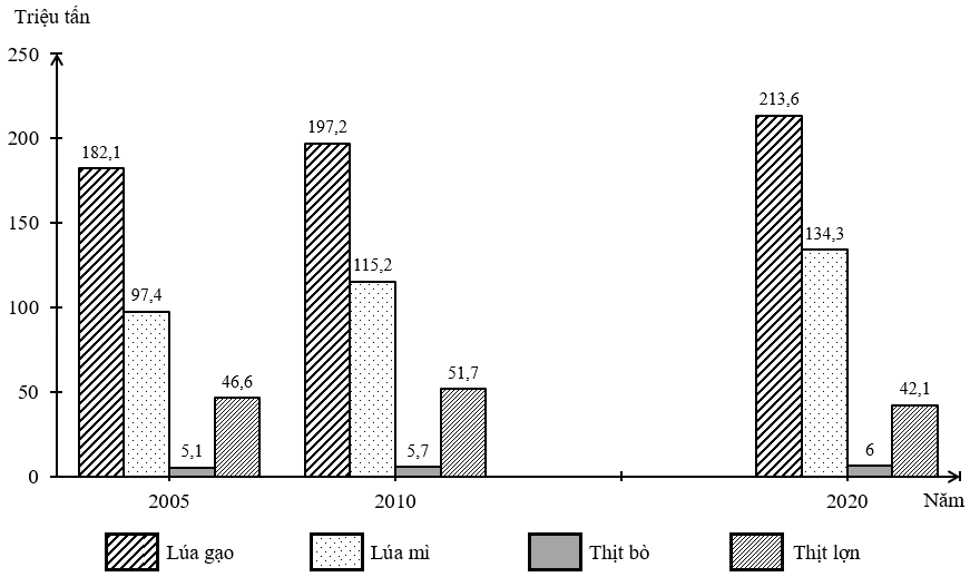 Thịt lợn có xu hướng tăng, lúa gạo xu hướng giảm nhanh qua các năm.