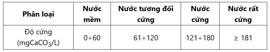 Độ cứng toàn phần là tổng nồng độ mol của các ion Ca2+ và Mg2+ được tính theo đơn vị mol/L hoặc mmol/L hoặc mg CaCO3 (giả thiết rằng 1 mol Mg2+ hay 1 mol Ca2+ tương đương với 1 mol CaCO3). Theo phân loại của Cục Khảo sát Địa chất Hoa Kỳ, nước được chia thành các loại sau: