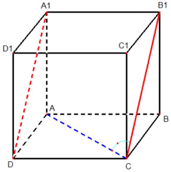 - Đưa về góc giữa hai vector đồng quy. Với hình lập phương, đường chéo mặt và đường chéo không gian thường tạo ra các tam giác đặc biệt (thường là đều).