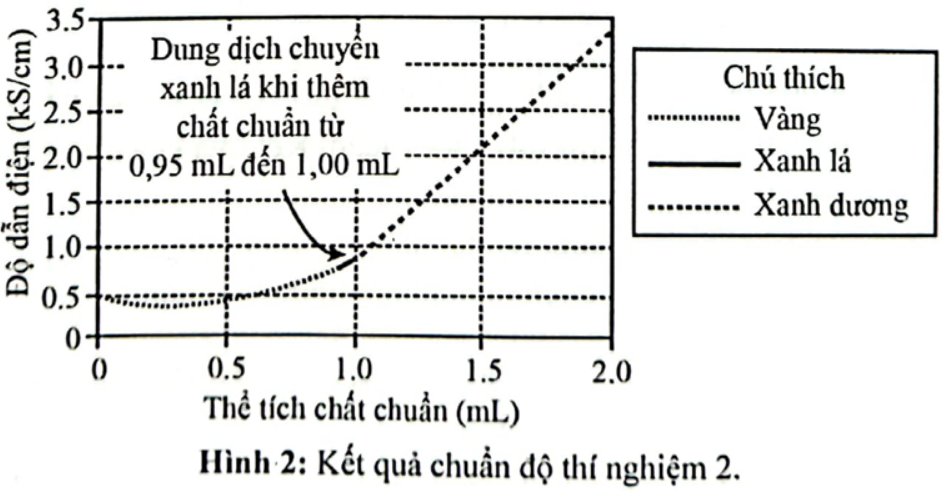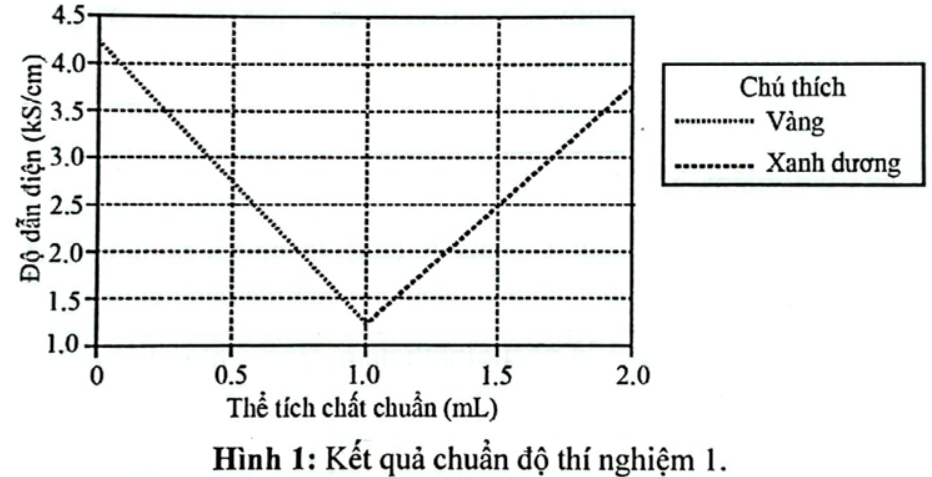 Thêm 1 giọt chỉ thị nitrazine vàng vào bình tam giác chứa 100 mL dung dịch HCl mẫu. Cho đầu máy đo độ dẫn điện vào lòng dung dịch. Dung dịch NaOH được nhỏ từ từ vào dung dịch. Sau mỗi lần nhỏ, lắc đều dung dịch mẫu, ghi lại màu và độ dẫn điện của dung dịch. Kết quả được tổng hợp trong Hình 1.