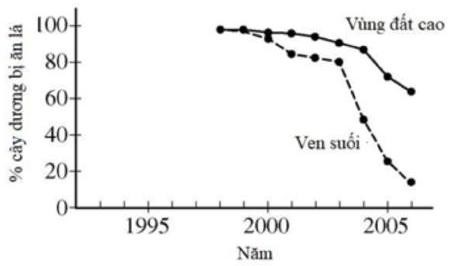 Hình 2: Phần trăm cây dương bị ăn lá ở vùng đất cao và ven suối