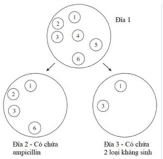Người ta nuôi cấy tất cả các vi khuẩn này trong môi trường cơ bản không có chất kháng sinh (đĩa 1), các vi khuẩn sinh trưởng thành các khuẩn lạc (1 nhóm vi khuẩn phát triển từ 1 vi khuẩn ban đầu) được đánh số từ 1 đến 6. Sau đó người ta lấy vi khuẩn từ các khuẩn lạc của đĩa 1 nuôi cấy ở vị trí tương ứng lên đĩa 2 (có kháng sinh ampicilline) và đĩa 3 (có cả 2 chất kháng sinh ampicillin va tetracyline).