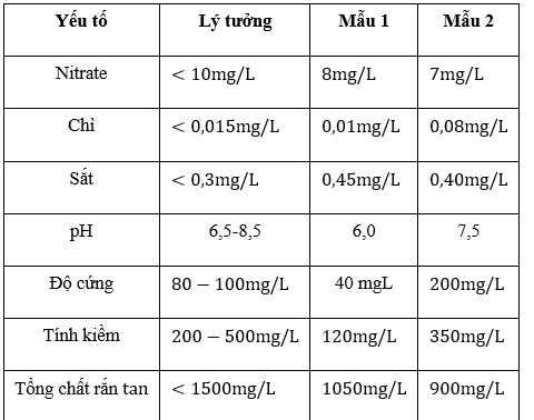 Bảng 1: Chất lượng hai mẫu nước và chất lượng nước lý tưởng