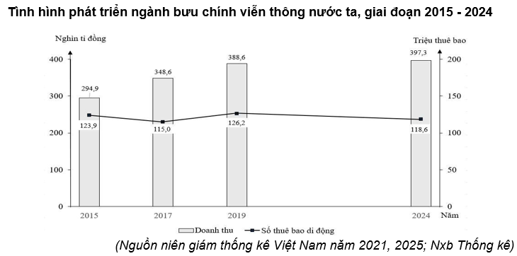 Từ năm 2015 – 2024, ngành bưu chính viễn thông có doanh thu tăng không liên tục.