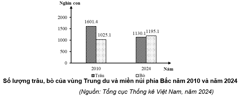 Năm 2010 và năm 2024, số lượng bò luôn nhiều hơn trâu và giảm.