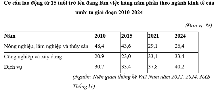 Giai đoạn 2010-2024, tỉ lệ lao động nông nghiệp, lâm nghiệp và thủy sản giảm mạnh và liên tục.