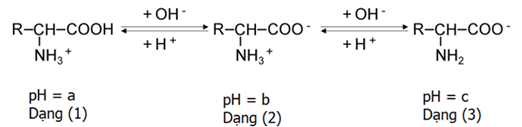 (2) Đúng, dạng (1) được proton hóa hoàn toàn nên pH thấp nhất, dạng (3) tách proton hoàn toàn nên pH cao nhất, dạng (2) là trung gian. Vậy a < b < c.