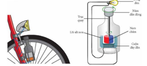 Hình bên mô tả một dynamo gắn trên xe đạp và sơ đồ cấu tạo của nó. Khi xe đạp chạy, bánh xe làm cho núm dẫn động quay, kéo theo nam châm quay. Khi đó trong cuộn dây xuất hiện dòng điện, làm cho bóng đèn mắc nối tiếp với cuộn dây sáng lên.