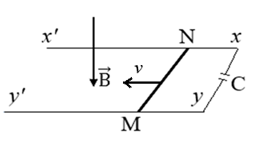 Thanh dẫn điện MN dài 20 cm đặt nằm ngang trên hai thanh ray dẫn điện \(x\) ' \(x\) và \(y\) ' \(y\) và luôn tiếp xúc với nhau. Hai đầu thanh ray được nối với một tụ điện có điện dung \(C = 4,7\mu \;{\rm{F}}\) như hình vẽ. Hệ thống đặt trong từ trường đều có cảm ứng từ theo phương thẳng đứng vuông góc với các thanh ray, độ lớn \(B = 0,45\;{\rm{T}}\). Bỏ qua điện trở của các thanh. Kéo cho thanh MN chuyển động đều với tốc độ \(v = 3\;{\rm{m}}/{\rm{s}}\).