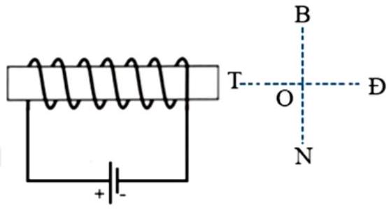 Dòng điện đi ra cực dương và đi vào cực âm. Áp dụng quy tắc nắm tay phải được đường sức từ trong lòng ống dây có chiều từ trái sang phải. Theo quy tắc vào Nam ra Bắc thì cực Nam của kim nam châm chỉ về phía điểm T.