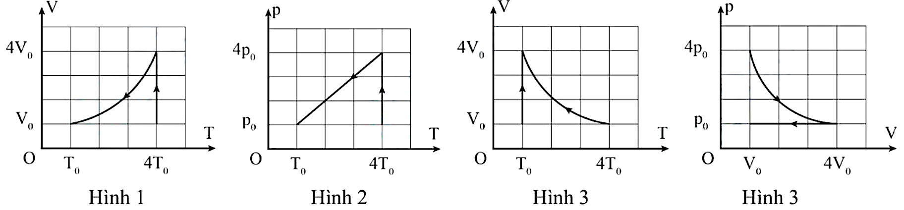 Trạng thái 3 là: \({{\rm{p}}_0}\) \(\frac{{{{\rm{V}}_0}}}{4}\) T0
