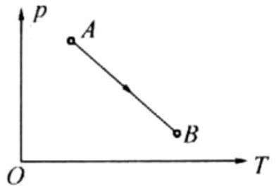 Từ phương trình trạng thái: \(\frac{{pV}}{T} = {\rm{const}}\), ta thấy khi khí chuyển trạng thái từ A sang B, áp suất khí giảm, nhiệt độ khí tăng → thể tích khí tăng