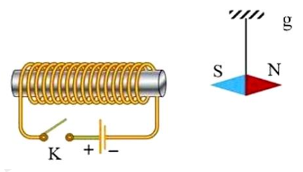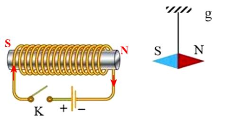 Áp dụng quy tắc nắm tay phải ⇒ Từ trường do ống dây sinh ra có chiều hướng từ phải sang trái, nghĩa là bên trái là cực Bắc, bên phải là cực Nam. Do đó ống dây đẩy nam châm.