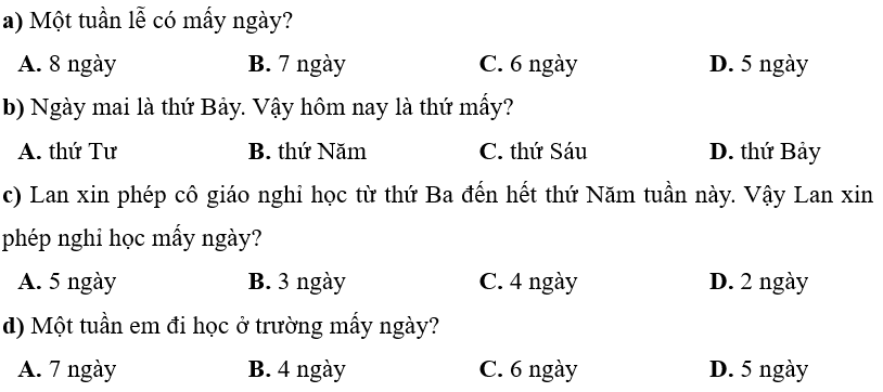 Lan xin phép cô giáo nghỉ học từ thứ Ba đến hết thứ Năm tuần này. Vậy Lan xin phép nghỉ học 3 ngày. Đó là: thứ ba, thứ tư, thứ năm.