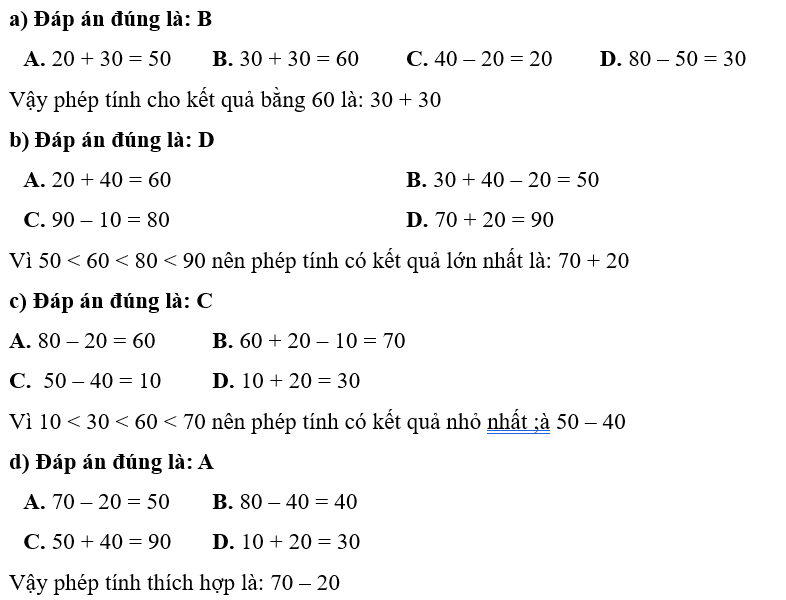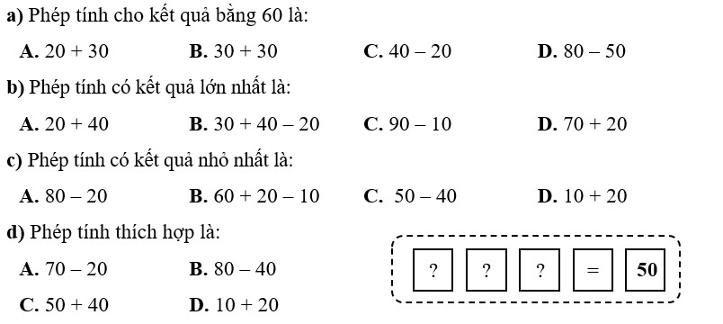 Phiếu bài tập hàng ngày Toán lớp 1 Chân trời sáng tạo Bài 2. Các phép tính dạng 30 + 20, 50 - 20 có đáp án