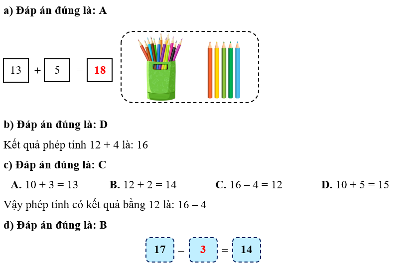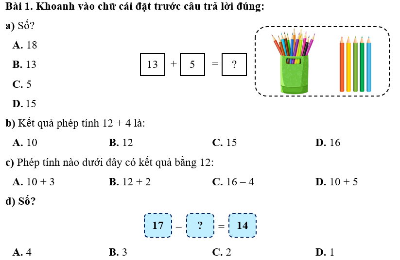 Phiếu bài tập hàng ngày Toán lớp 1 Chân trời sáng tạo Bài 3. Các phép tính dạng 12 + 3, 15 - 3 có đáp án