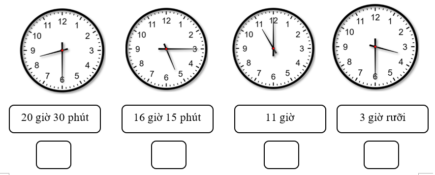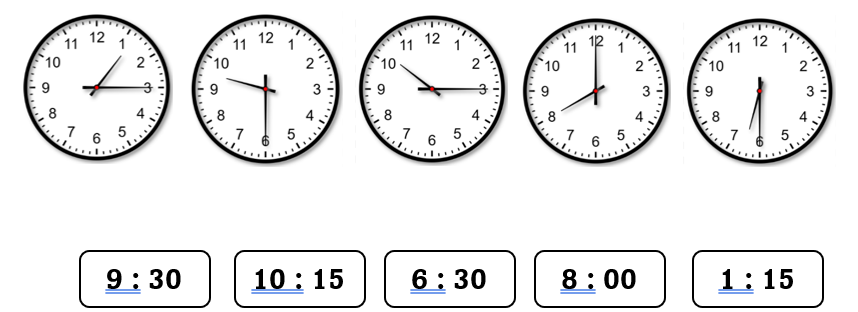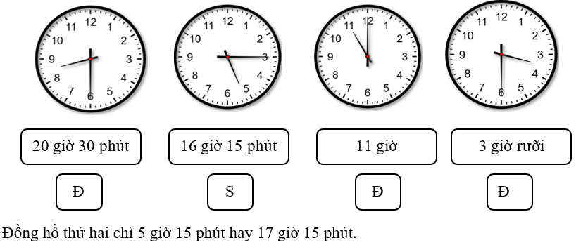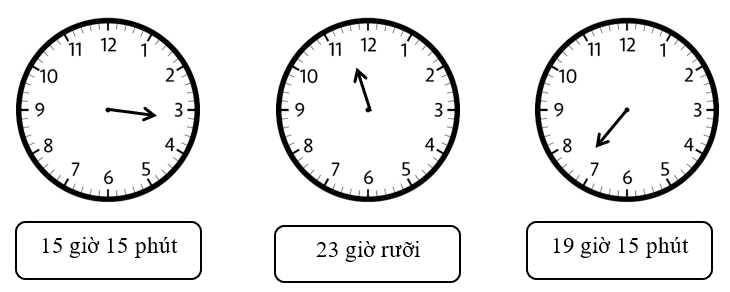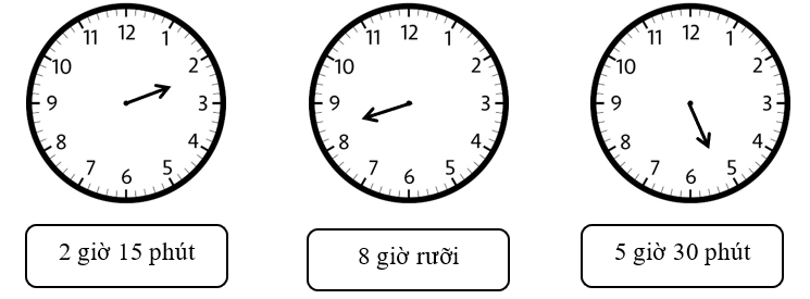 Đồng hồ A chỉ 9 giờ 15 phút, đồng hồ B chỉ 10 giờ, đồng hồ C chỉ 2 giờ 30 phút