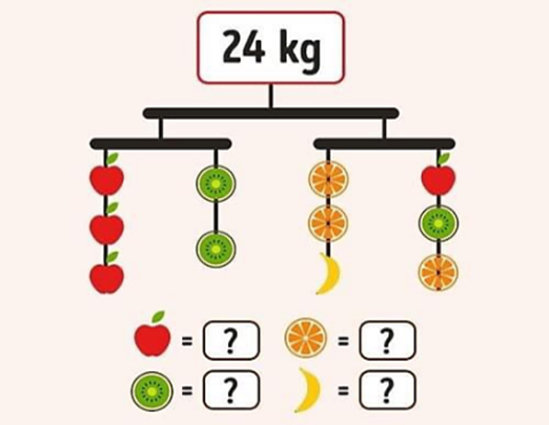• 2 cam + 1 chuối = 1 táo + 1 kiwi + 1 cam = 6 kg