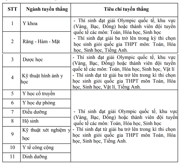 · Thí sinh đoạt giải nhất, nhì, ba trong Cuộc thi Khoa học kỹ thuật cấp quốc gia có đề tài đoạt giải phù hợp với ngành đào tạo được xem xét tuyển thẳng vào các ngành: Điều dưỡng, Hộ sinh, Kỹ thuật xét nghiệm y học, Kỹ thuật hình ảnh y học, Y tế công cộng, Dinh dưỡng.