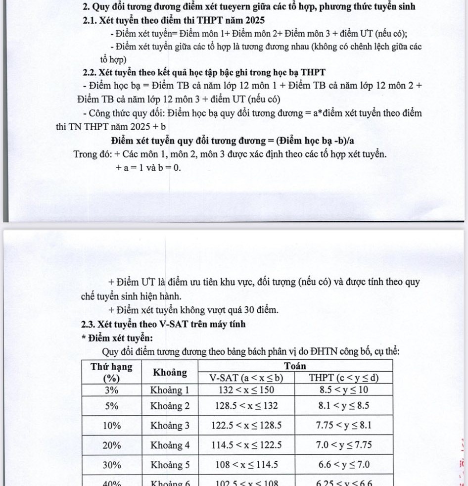 Các bảng này cho thấy phương thức xét tuyển bằng điểm V-SAT được thực hiện thông qua việc quy đổi tương đương sang điểm thi Tốt nghiệp THPT theo phương pháp bách phân vị, đảm bảo tính công bằng theo thứ hạng thí sinh. Quan trọng hơn, công thức tính điểm xét tuyển cuối cùng khẳng định lại rằng: "Điểm xét tuyển giữa các tổ hợp là tương đương nhau (không có chênh lệch giữa các tổ hợp)." Việc áp dụng nguyên tắc quy đổi điểm chi tiết này, cùng với việc tất cả các ngành đều lấy mức chuẩn đồng loạt $15.0$ điểm, tạo nên một chính sách tuyển sinh thống nhất và minh bạch, cho phép thí sinh sử dụng điểm V-SAT, điểm thi THPT, hay các tổ hợp môn khác nhau đều có cơ hội trúng tuyển ngang nhau vào cùng một ngành, tập trung nguồn lực đầu vào cho các lĩnh vực đặc thù của trường.