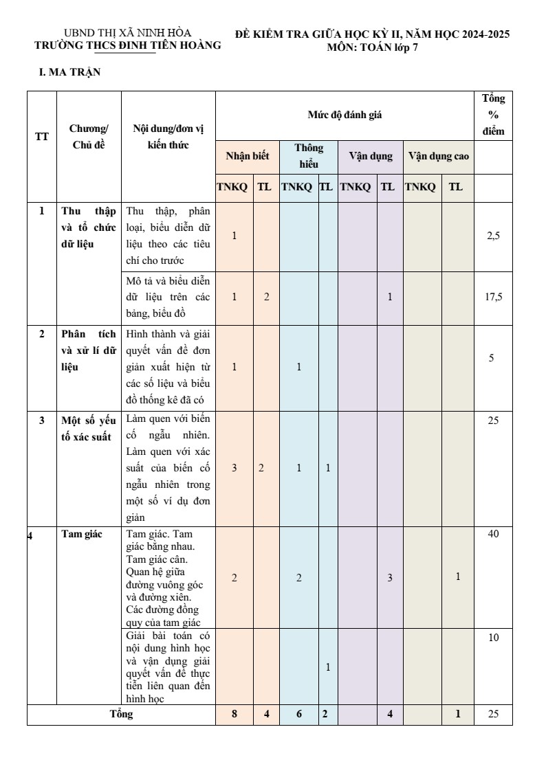 B. Nội dung Đề thi giữa học kì 2 Toán 7 trường THCS Đinh Tiên Hoàng (Khánh Hòa) năm 2024–2025