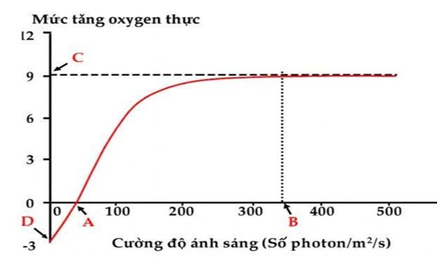 Câu 1. Đồ thị bên mô tả mức tăng lượng oxygen thực (µmol/m2/s) trong lá của cây X liên quan đến cường độ ánh sáng. Biết rằng trong quá trình thí nghiệm, cường độ hô hấp không đổi. Dựa vào đồ thị, hãy xác định các điểm A, B, C, D là điểm nào trong các điểm sau: