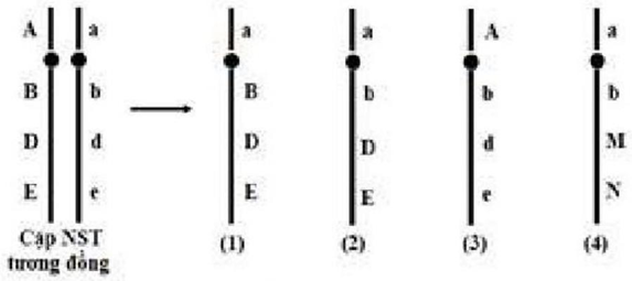 Câu 1. Hình bên dưới mô tả cấu trúc của một cặp nhiễm sắc thể tương đồng và các giao tử được tạo ra, các chữ cái là các gene trên nhiễm sắc thể. Có bao nhiêu giao tử không mang NST bị đột biến cấu trúc?