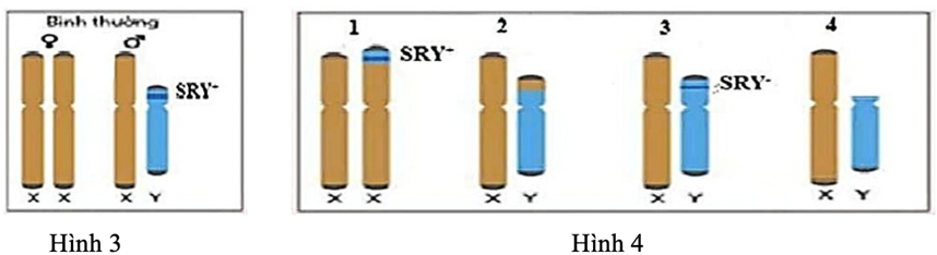 Câu 1. Ở người, trên cánh ngắn của NST Y có gene SRY (sex-determining region Y gene) quy định giới tính nam. Vì vậy, giới tính được quyết định bởi việc có hay không có NST Y mang vùng gene ; Hình 3 mô tả 2 cặp NST giới tính (XX và XY) ở người bình thường. Một người nhìn bề ngoài là nam nhưng khi xét nghiệm NST bác sĩ nói rằng bản thân họ là nữ về mặt di truyền. Người đó có thể có cặp NST nào trong số 4 cặp NST giới tính ở Hình 4?