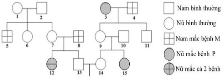 Câu 1. Sơ đồ phả hệ dưới đây mô tả hai bệnh di truyền ở người, bệnh P do một gene có 2 allele trên NST thường quy định, bệnh M do một gene có 2 allele trên NST X tại vùng không tương đồng với NST Y quy định. Biết rằng không xảy ra đột biến ở tất cả các cá thể trong phả hệ. Theo lý thuyết nếu người số 11 kết hôn với người dị hợp về cả hai cặp gene thì xác suất để cặp vợ chồng này sinh được một đứa con trai bình thường là bao nhiêu? (tính làm tròn đến 2 chữ số sau dấu phẩy).