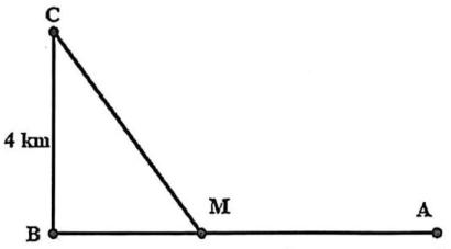 Câu 5: Một đường dây điện được nối từ một nhà máy điện ở A đến một hòn đảo ở C như Hình 1.40. Khoảng cách từ C đến B là 4km. Bờ biển chạy thẳng từ A đến B với khoảng cách là 10km. Tổng chi phí lắp đặt cho 1 km dây điện trên biển là 50 triệu đồng, còn trên đất liền là 30 triệu đồng. Biết rằng có vị trí điểm M trên đoạn AB (điểm nối dây từ đất liền ra đảo) để tổng chi phí lắp đặt là nhỏ nhất, tính độ dài BM (đơn vị kilômét).