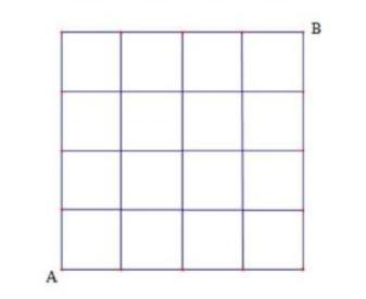 Câu 3. Cho một lưới ô vuông gồm 16 ô vuông nhỏ, mỗi ô vuông có kích thước 1x1 (mét) như hình vẽ. Con kiến thứ nhất ở vị trí A muốn di chuyển lên vị trí B, con kiến thứ hai ở vị trí B muốn di chuyển xuống vị trí A. Biết rằng, con kiến thứ nhất chỉ có thể di chuyển ngẫu nhiên về phía bên phải hoặc lên trên, con kiến thứ hai chỉ có thể di chuyển ngẫu nhiên về phía bên trái hoặc xuống dưới (theo các cạnh của lưới). Hai con kiến xuất phát cùng một thời điểm và cùng có vận tốc di chuyển là 1mét/1phút. Xác suất để hai con kiến không gặp nhau bằng bao nhiêu? (Kết quả làm tròn đến hàng phần trăm).
