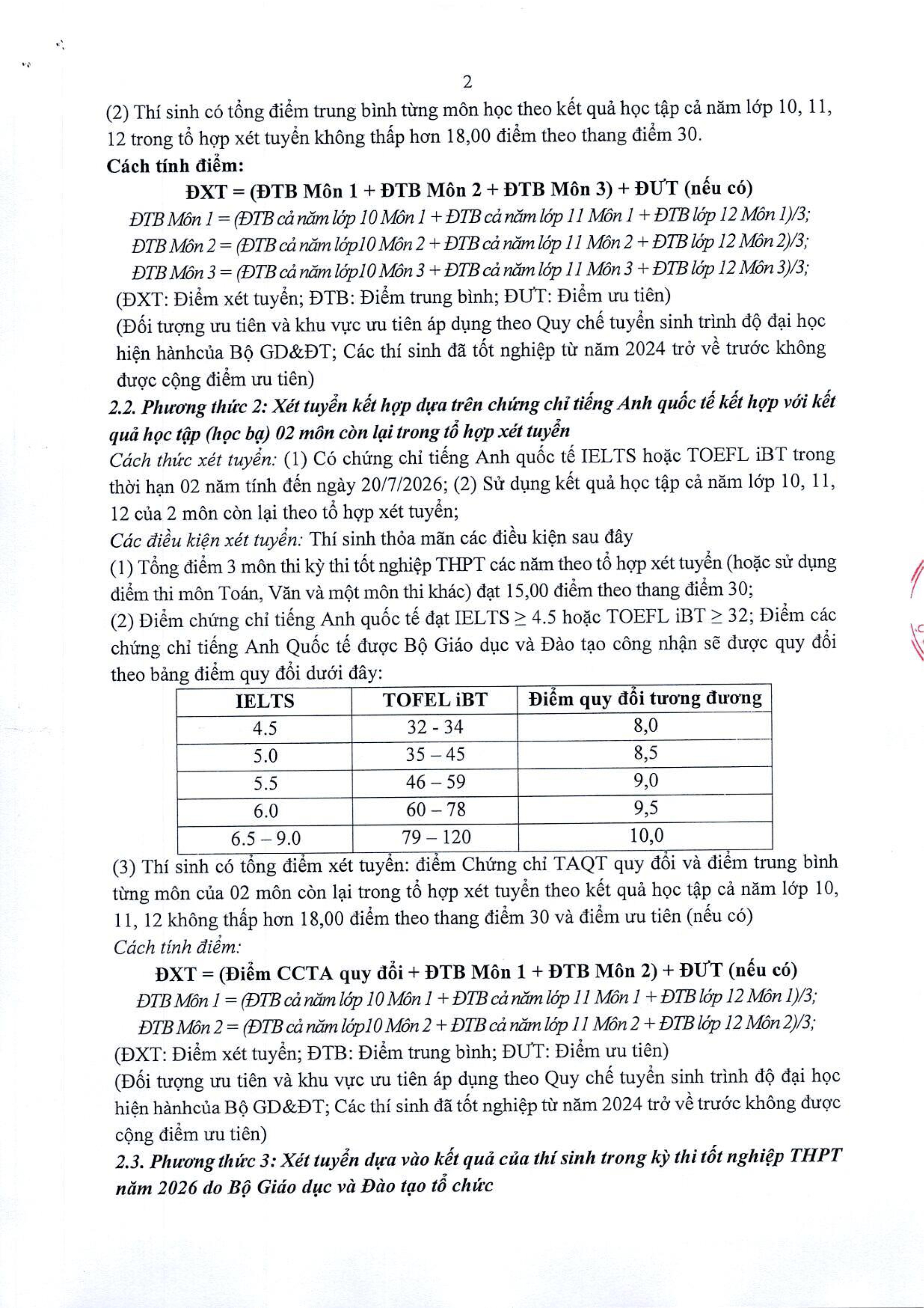 Cách thức xét tuyển: Có chứng chỉ tiếng Anh quốc tế IELTS hoặc TOEFL iBT trong thời hạn 02 năm tính đến ngày 20/7/2026; (2) Sử dụng kết quả học tập cả năm lớp 10, 11, 12 của 2 môn còn lại theo tổ hợp xét tuyển;
